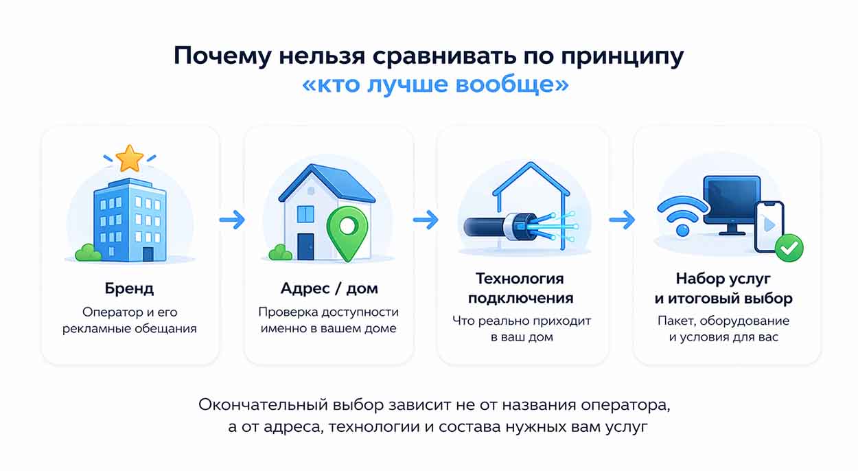 Выбор между операторами начинается с проверки дома и технологии, а не с сравнения брендов по витрине