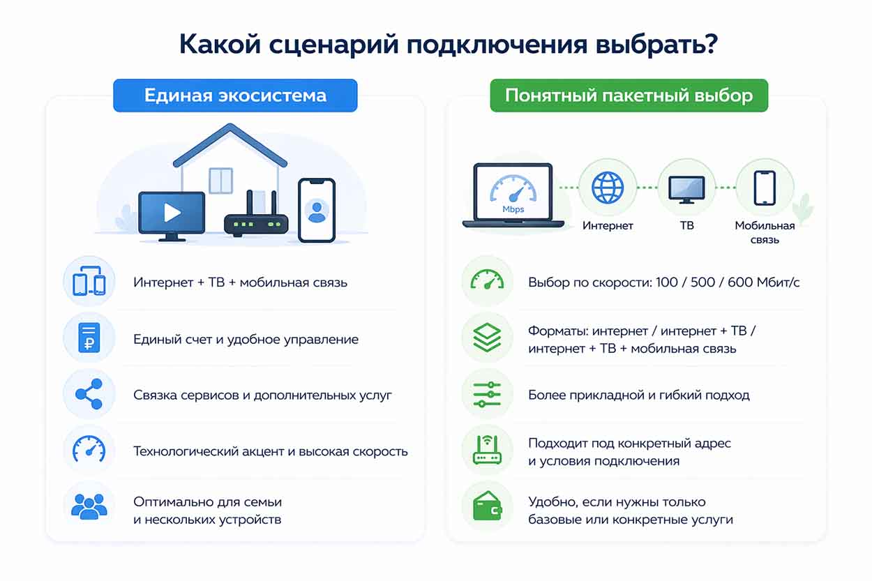 При выборе провайдера важно понять, что вам ближе: единая экосистема услуг или более прямой выбор пакета под квартиру и нужные скорости