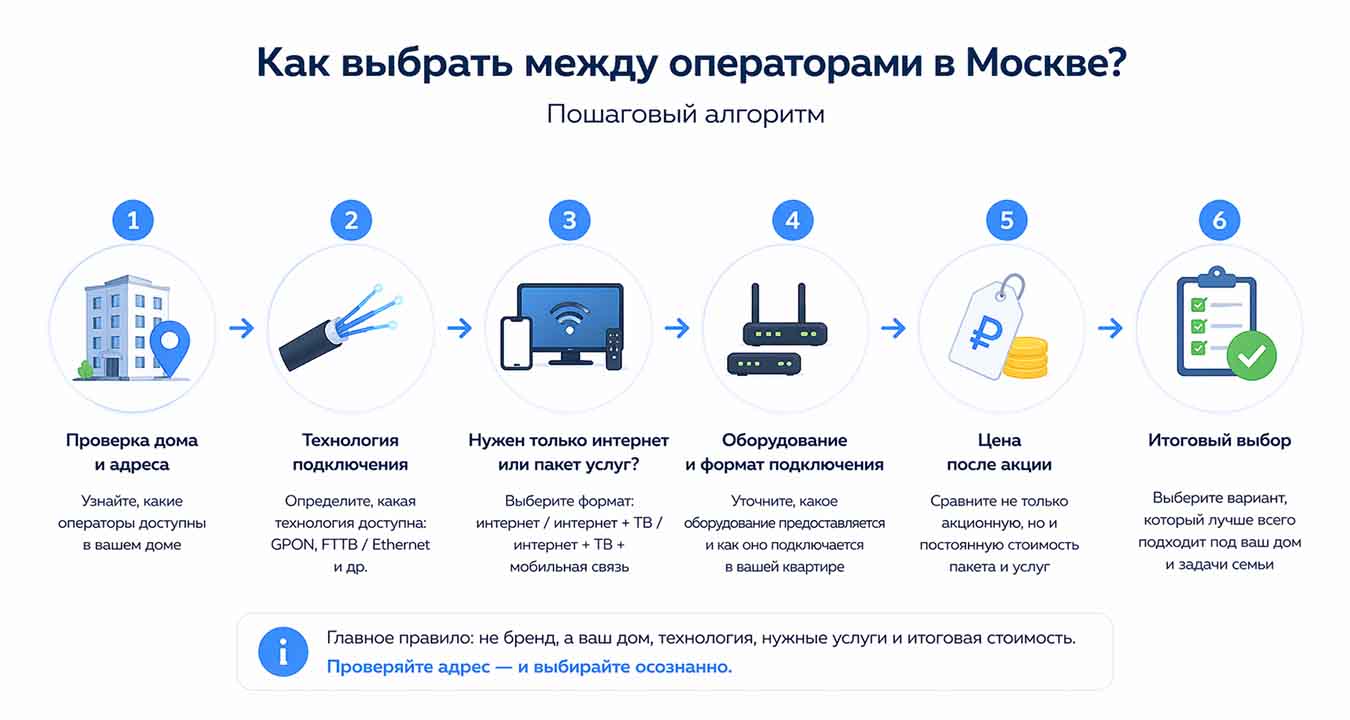 Перед выбором между МТС и Билайном в Москве полезно пройти короткую последовательность. Сначала — проверка дома и адреса. Затем — технология подключения: что реально приходит в дом и какое оборудование потребуется. После этого — формат пакета: нужен ли только интернет, интернет + ТВ, интернет + мобильная связь или единая экосистема «все в одном». И только потом — сравнение промо-цены, постоянной цены и общего удобства сервиса.